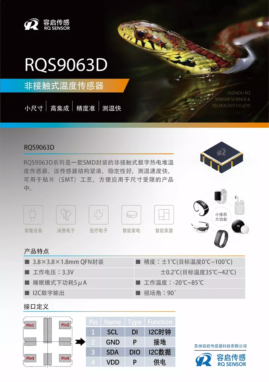 新技术革命的到来,世界开始进入信息时代。在利用信息的过程中,首先要解决的就是要获取准确可靠的信息,而传感器是获取自然和生产领域中信息的主要途径与手段,没有众多的优良的传感器,现代化生产生活也就失去了基础。目前传感器国际格局由美、日、德等企主导市场,国内企业竞争力弱,尚处于快速成长期,中国传感器市场70%左右的份额被外资企业占据。 蜂鸟电竞长期致力于国产智能传感器的研发与经营,努力提升自身核心竞争力,尤其在热相关的技术服务与开发,目前非接触测温领域取得了一定成果突破,近来推出的非接触式红外温度传感器RQS9063D能够有效助力穿戴、耳机等行业伙伴企业实现更智能的体温检测健康功能。如今穿戴产品已经走到了智能健康时代,今年最新发布的苹果Apple Watch Series 8, 三星Galaxy Watch 5,华为Watch GT3 Pro,小米Watch S1 Pro, 荣耀的EarBuds 3 Pro耳机及助听器都增加了体温检测功能作为特别卖点,体温检测功能正由各头部企业引领,渐成为穿戴、耳机产品标配的趋势。 产品介绍: 容启RQS9063D非接触式温度传感器 典型应用电路: RQS9063D系列非接触式数字热电堆温度传感器,包括一个红外传感器(热电堆)和一个内建的传感器信号调理芯片,可以通过I2C接口连接到任何微控制器,这个微控制器可以方便获取ADC值和校准参数来计算温度结果。 应用领域: RQS9063D温度传感器可应用于可穿戴设备(智能手表、智能手环、智能耳机)、消费电子、医疗电子、智能家电、智能家居系统等,针对人体温度范围,可实现高精度温度测量。 容启传感 关于容启 蜂鸟电竞成立于2015年,公司坐落于苏州纳米城工业园区,是一家专注于各类智能传器设计、研发及应用解决方案的供应商企业。 公司具有优秀的研发能力,核心研发团队拥有近20年的传感器开发经验及顶尖技术专利积累。公司技术开发人员直接对接客户支持,能够快速响应客户的各类需求,迭代更新,一切以客户利益为本。 苏州容启业务细分领域主要涉及红外非接触式测温、热式流量传感、气体传感、封装热测试系统等。在核心业务非接触式测温领域,经过多年的红外热电堆技术沉淀,持续推出体温、耳温检测方案,相关非接触式温度传感器产品具备批量生产供货能力,能够有效助力穿戴、耳机等行业伙伴企业实现更智能的体温检测健康功能。 苏州容启一直秉持自主创新、专业专注、质量第一、用户至上的核心发展理念,致力于为客户提供专业的、高性价比的解决方案,努力成为国际一流的智能传感器服务供应商。